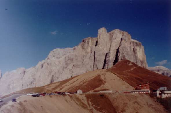 | Langkofelmassiv, mittig die Langkofelscharte auf die eine Seilbahn führt. Zu empfehlen ist eine Auffahrt zur Scharte, Aufstieg ist über einen Serpentinenweg auch möglich, und eine Umrundung des Langkofels (ca. 4-5 h). Eine sehr schöne Wanderung. | ||